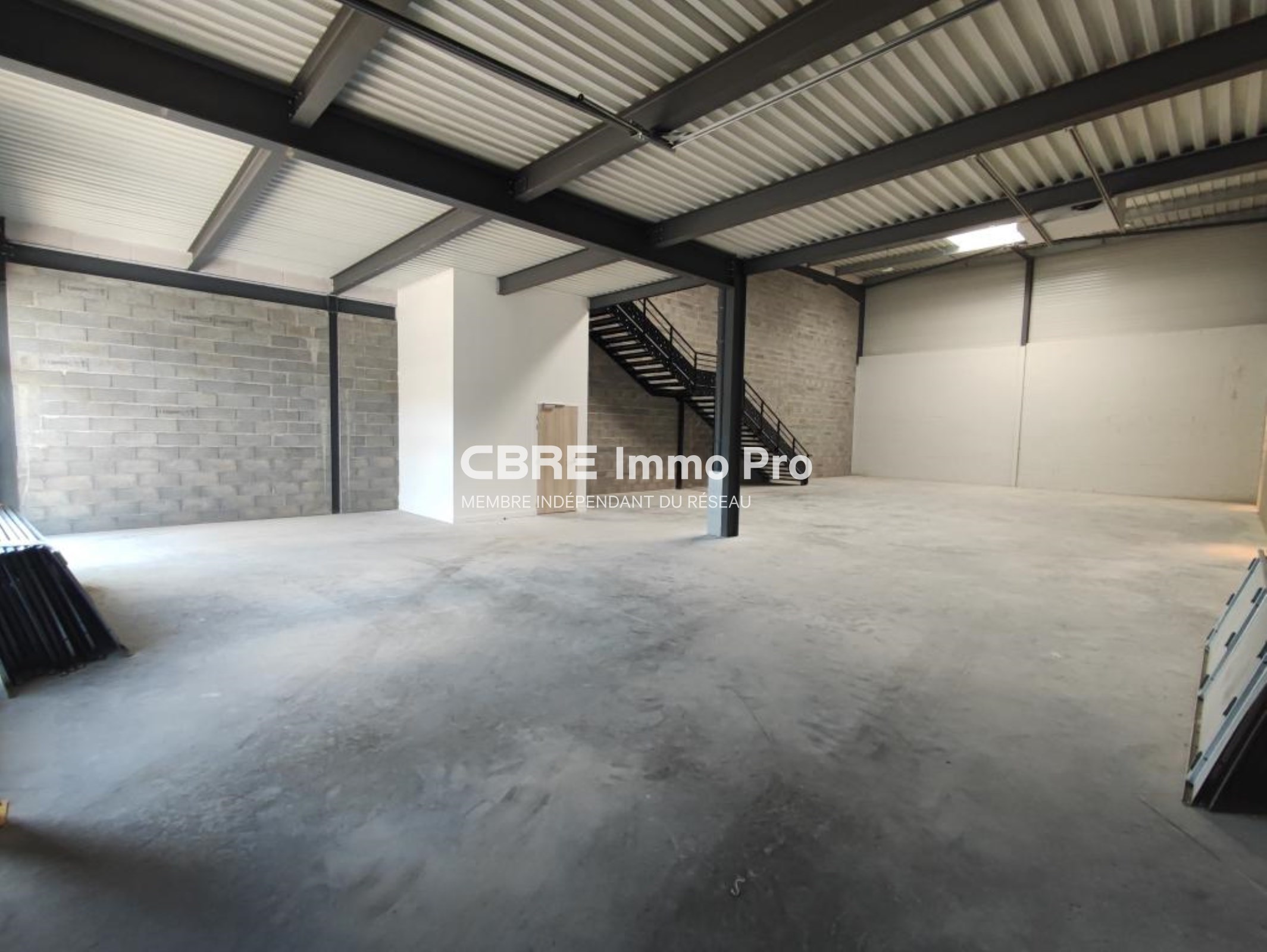 Aménagement type lot témoin- au rdc : un wc PMR, un aérotherme, l'éclairage de la halle d'activité, un escalier métallique. Le plateau de bureau en mezzanine est aménagé de la façon suivant : sol souple, faux plafond, éclairage LED, peinture, clim réversible, goulotte périphérique deux compartiments(le courant faible n'est pas réalisé)